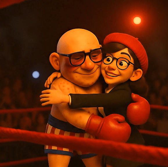 Hearing his voice, she rushes through the cheering crowd toward the boxing ring. When she finally reaches him, the emotional moment becomes the highlight of the story as the two embrace each other in the ring.