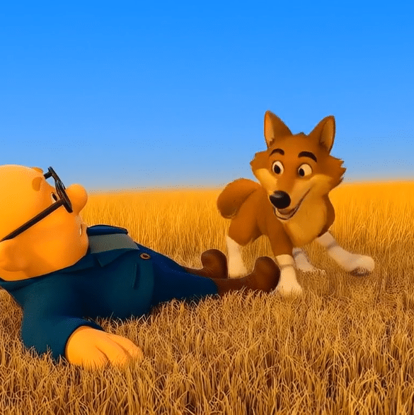 The animation begins with a man riding a horse across a wide landscape. After stopping, he jumps down from the horse and begins walking across the field. Suddenly, a wolf approaches him from the side. At first, the man thinks the wolf might be dangerous and tries to scare it away.